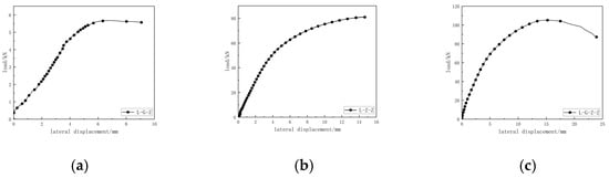 Load-lateral displacement relationship curve of L-shaped composite special-shaped column. (a) L-G-Z load-lateral displacement; (b) L-Z-Z load-lateral displacement; (c) L-G-Z-Z load-lateral displacement.