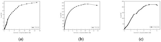 Load-transverse displacement comparison diagram of T-shaped column. (a) T-G-Z load-lateral displacement; (b) T-Z-Z load-lateral displacement; (c) T-G-Z-Z load-lateral displacement.