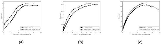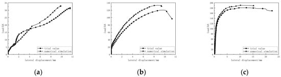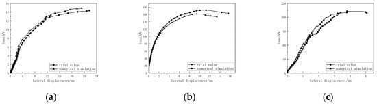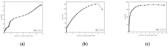 Comparison of load-transverse displacement of cross-shaped columns. (a) S-G-Z load-lateral displacement; (b) S-Z-Z load-lateral displacement; (c) S-G-Z-Z load-lateral displacement.