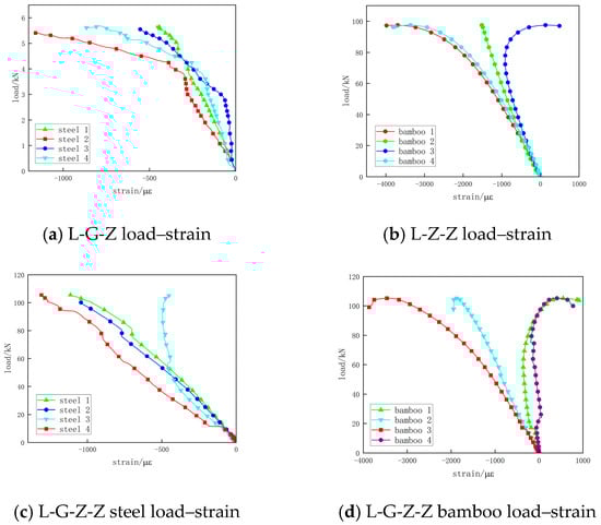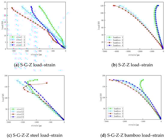 It can be seen from Figure 25c,d that, at the same stage, the strain of the bamboo scrimber is greater than that of steel. The cross-shaped steel–bamboo composite special-shaped column is in the elastic stage before being loaded to about 50% of the ultimate load, and the strains of all the steels and all the bamboo scrimbers are approximately overlapped, respectively. When the loading is continued, the specimen turns into the elastic-plastic stage, and glue failure constantly occurs in the specimen. During the loading process, the whole specimen is always in the compression state, and all the strain values are negative.