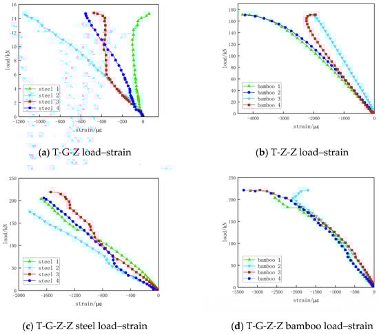 It can be seen from Figure 24c,d that in the loading process of a T-shaped steel–bamboo composite special-shaped column, steel and bamboo scrimber have the same strain development trend, which is basically maintained in the elastic stage, indicating that steel and bamboo scrimber work together under the action of epoxy resin adhesive and bolt. As the glue failure occurs constantly in the loading process of the test, the load–strain curve of steel shows an uneven growth and all the bamboo load–strain curves are regarded as overlap in the elastic stage, which indicates that the specimen is in the axial compression state.
