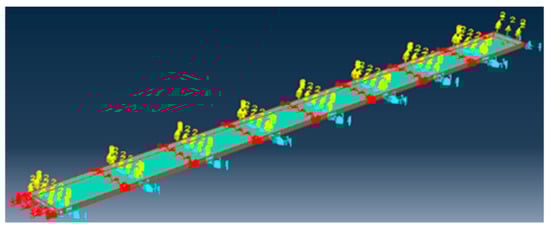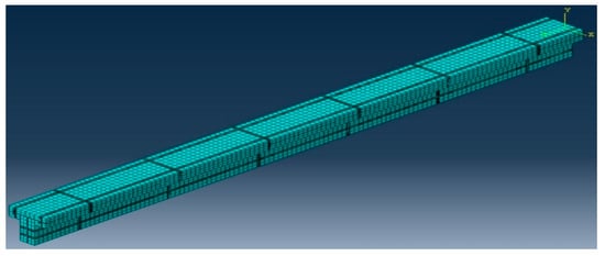 Set the upper-end constraint of the specimen as translational freedom along the x-axis and y-axis directions and the rotational freedom along the x-axis, y-axis, and z-axis directions. Apply the displacement in the direction z on the reference point of the backing plate and set the lower-end constraint as the translational freedom along the x-axis, y-axis, and z-axis directions and the rotational freedom along the x-axis, y-axis, and z-axis directions. After the setting is completed, conduct the grid division; the model grid division diagram is shown in Figure 27.