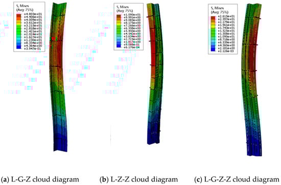 The stress cloud diagram of the L-shaped column is shown in Figure 28. The middle flange of the L-G-Z specimen is bent, the flange is buckled in a wave shape, and the specimen is bent integrally and has instability failure. The L-Z-Z specimen is bent, the middle part of the long flange is obviously deformed, and the specimen is subject to bending instability failure. The L-G-Z-Z inner steel is buckled in wave shape, and the specimen is obviously bent and has instability failure.