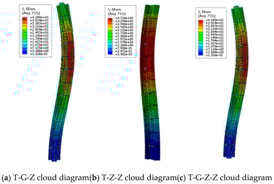 Figure 30 shows the stress cloud diagram of the T-shaped column. The T-G-Z web is bent and twisted towards the flange, and distortional buckling appears in the middle of one flange. The specimen has the failure modes of distortional buckling and flexural-torsional buckling. The T-Z-Z has an obvious bending effect integrally, and the specimen is subject to bending failure integrally. The steel in the middle of T-G-Z-Z has wave-shaped bending, and the specimen is bent integrally; thus, the specimen has instability failure and plate-buckling failure.