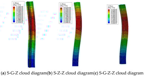 Figure 32 shows the stress cloud diagram of the cross-special-shaped column. The front flange of S-G-Z has wave-shaped buckling, it is twisted integrally, and the specimen is subjected to local buckling and flexural-torsional buckling failure. The middle-upper part of S-Z-Z has obvious bending deformation, and finally, the specimen has instability failure. All the internal plates of S-G-Z-Z show wave-shaped buckling; they have obvious bending integrally, and the ultimate failure of the specimen is instability failure and plate buckling.