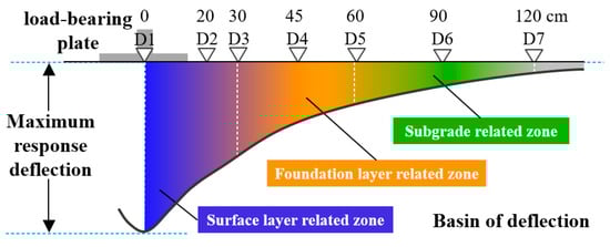 As a representative non-destructive dynamic detection technical equipment, the FWD (Falling Weight Deflectometer), Dynatest 8000, has been widely used internationally. Principally, it involves lifting a heavy object and allowing it to fall freely and then hammering a load-bearing plate with a certain rigidity to apply load to the pavement structure. In this way, instantaneous deformation can be generated on the measured pavement. The deformation response on the surface of the pavement structure layer is measured using sensors closely attached to the pavement, and the data of the dynamic deflection basin can then be obtained. The schematic of the deflection basin is shown in Figure 1.