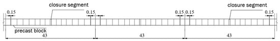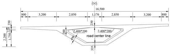 A precast continuous rigid frame bridge scheme was adopted for a viaduct expressway project. In this paper, a continuous precast rigid frame bridge with a span of 3 × 43 m was used for calculation and verification. This span comprised a precast continuous rigid frame bridge with a single box and a single prestressed concrete chamber with a uniform cross-section. The midspan cross-section of the main girder is shown in Figure 4. The middle span and side spans are both composed of 14 precast blocks and are precast with C60 concrete. A 15 cm wet joint was set at the position of block No. 0 at the pier top and between the precasts. The midspan closure section was cast in place with concrete of the same grade. The main girder adopted a prestressed concrete box girder with a single box and single chamber and equal beam height and inclined webs. The full bridge profile is shown in Figure 5. The prefabricated assembly lengths of the cantilevered sections are 2.9 m and 2.4 m. The width of a single box girder is 16.5 m, the width of the bottom plate is 2.8 m, the cantilever length is 4.0 m, and the height of the box girder is 2.2 m. A 0.1 m thick asphalt pavement layer is laid on the top of the bridge deck.
