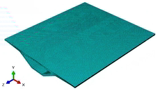 ABAQUS software was used to establish a finite element model of the fully assembled girder bridge of the target bridge. The main girder and asphalt part were modeled using C3D8R, while prestressed tendons were modeled using T3D2 elements []. The mesh type is divided into structured meshes. However, because the finite element model is relatively complex, structured meshes cannot be directly divided. Therefore, the partition tool was used to divide some irregular areas of the model and then perform mesh division to obtain a better mesh. In this section, when modeling, a combination of global seeding and local refinement of beam sections was used for mesh division. The mesh size was x × y × z = 0.2 m × 0.2 m × 0.2 m; when modeling, the horizontal coordinate (bridge deck horizontal) is the X-axis, the vertical coordinate (depth direction) is the Y-axis, and the vertical coordinate (driving direction) is the Z-axis. In the range of measurement points under the action of the drop weight, the asphalt pavement layer and concrete beam section meshes of the main span were encrypted with x × y × z = 0.1 m × 0.2 m × 0.1 m. Ultimately, a total of 301,820 nodes and 204,635 elements were set for the whole bridge. The local finite element mesh model of the box girder is shown in Figure 6.