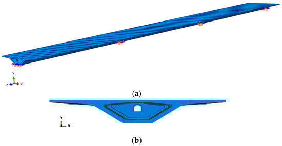 Finite element model for dynamic load of the whole bridge. (a) Elevation view of the whole bridge. (b) Sectional view at midspan of the middle span.