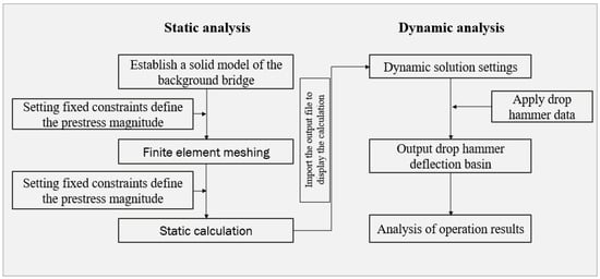 The implicit calculation method was used in the numerical simulation test. The analysis process is shown in Figure 8. First, the implicit analysis method was used to establish a solid model of the background engineering bridge. The implicit calculation outputs the implicit calculation file after the entire model reaches stress equilibrium to achieve the static stress equilibrium solution. Thereafter, the implicit calculation file with initial conditions was imported into the implicit dynamic analysis for dynamic solution setting, and the load time–history curve in Section 2.1 was imported to simulate the impact load. Finally, the drop weight deflection basin curve on the surface of the precast continuous beam bridge was output for analysis.