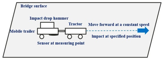 When applying the finite element method to the precast continuous rigid frame bridge, it is necessary to verify the correctness and accuracy of the finite element model used in the project research and check whether the finite element calculation results can reflect certain laws. Accordingly, the rapid health detection scheme for the background bridge using FWD equipment is shown in Figure 9. The mobile trailer carrying the impact falling weight moves under the traction of the tractor. Notably, the falling weight impacts the specified positions only. The dynamic response of the bridge is obtained through the vehicle-mounted sensor to obtain the deflection basin curve of the bridge structure.