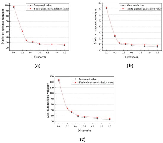 Due to the limited length of the article, three sets of data were randomly selected based on all the FWD-measured deflection basin data and measuring point locations in accordance with the model established by the finite element method in Section 3.2. Moreover, their calculation results are compared with the measured data, as listed in Table 5 and Figure 10.