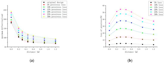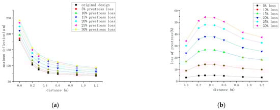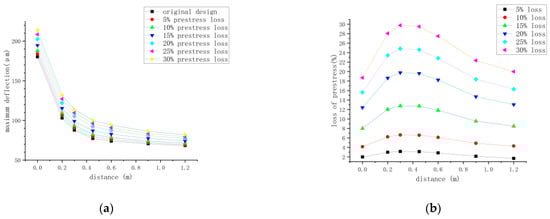 Changes in deflection points at the mid span bottom plate position. (a) Relationship between deflection basin curve and prestress loss of bottom slab. (b) Changes in each deflection point under different prestress losses of bottom slab.