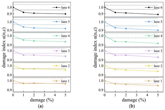 - The relationship between vehicle weight and vehicle-induced cable forces allows for the identification of the cable force influence line, adjusted for vehicle weight. Of all lanes, the sixth lane farthest from the cable exhibits the most pronounced trend in index changes when the cable experiences damage. At 1%, 2%, and 5% cable loss, the index loss rates are 8.4%, 9.15%, and 11.4%, respectively, all exceeding three times the standard deviation, indicating the index’s efficacy in assessing cable damage. Additionally, under the addition of 2% Gaussian noise, the index’s change trend remains distinct, but the standard deviation range increases. The index of 2% cable damage still exceeds three times the standard deviation, underscoring the index’s robustness.