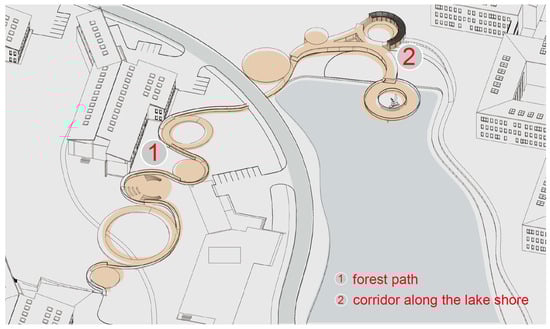 | “Hidden in the woods, quiet and private” reflects the strong independence of the campus buildings and the strong sense of identity between the buildings and the surroundings. | (1) The buildings are surrounded by tall and dense trees, the building units are relatively close, the architectural image is too hidden, and the building groups and units are close. (2) The external space of the campus has a low activity level and lacks sociality. | Connecting the paths using covered bridges. |