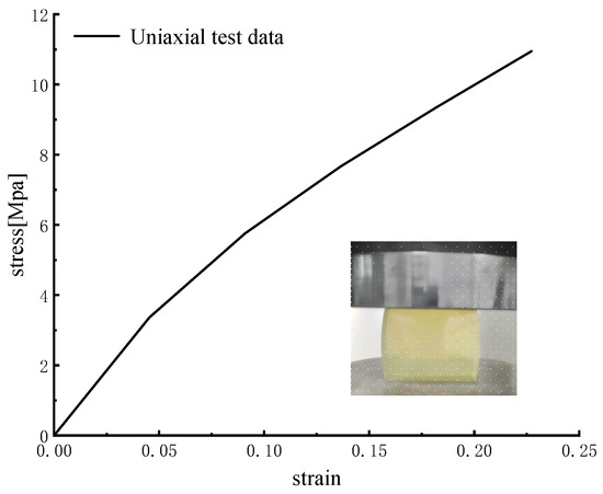 This experiment uses SolidWorks 2020 software for 3D modeling. The negative Poisson’s ratio structure with concave holes is composed of concave cell structures placed side by side, and the negative Poisson’s ratio structure with elliptical holes is composed of transverse elliptical holes and longitudinal elliptical holes placed alternately. Figure 1 shows the geometry of the two structures and the geometry of a single cell. The length L and height h of the model are 150 mm, and the depth is 50 mm. The porosity of the honeycomb structure is controlled to 50% by adjusting the size of the hole. The drawn model diagram was imported into ABAQUS 2021 finite element simulation software, and the material properties were obtained by uniaxial test on the test block (as shown in Figure 2). In order to reduce the amount of calculation needed, the model uses the hexahedral hybrid formula (c3d8h) for calculation. The upper and lower panels were constrained by rigid base plates. The structure was placed between the upper and lower rigid plates. The upper rigid plate RP-1 node gave a displacement of 30 mm in the Z direction. The lower rigid plate RP-2 node limited its displacement in all directions except the vertical direction. The grid sizes of the rigid plate and the negative Poisson’s ratio structure were determined as being 2.5 mm and 5 mm, respectively. At the same time, in order to prevent the phenomenon of mutual penetration after the deformation of the structure, the single-sided automatic contact algorithm was used for the whole model, the general contact algorithm was used between the rigid plate and the honeycomb structure, and phase behavior was applied to it. Finally, the coupling was set at RP-3, and the stress condition was analyzed in the ODB results.