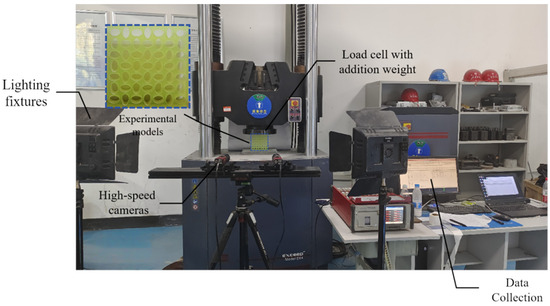 The experimental model uses polyurethane as the matrix material, which is a polymer material with excellent mechanical properties formed by the polycondensation of polyols and polyisocyanates [47]. It has good stability, chemical resistance, resilience and mechanical properties, and has the characteristics of being light weight and easy to process. Using the JRK-135S high-precision laser machine with an accuracy of 0.1 mm, two kinds of negative Poisson’s ratio structural test blocks with the same size and weight as the simulation model were made. An MTS universal testing machine was used to apply displacement to the two structures at a speed of 2 mm/min (as shown in Figure 3), and when the displacement was 0, 10, 20 and 30 mm, respectively, a high-speed camera was used to take photos of the compressed deformed samples to observe their stress conditions (as shown in Table 1 and Table 2). Finally, the deformation trend of the structure was made more accurate by comparing the experimental data with the simulation data on the stress on the top of the test block.