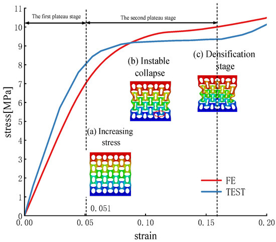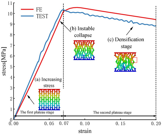 In the early stage of the first stage, the stress–strain relationship of the concave structure was linear, and the stress was in a stable rising state. When the strain reached 0.07, the stress had reached its peak, and then the various parts of the structure began to squeeze and deform each other. In the second stage, with the gradual increase in stress, the middle part of the structure became too extruded, resulting in structural instability and an uneven stress distribution, resulting in a gradual decrease in stress and no good deformation effect.