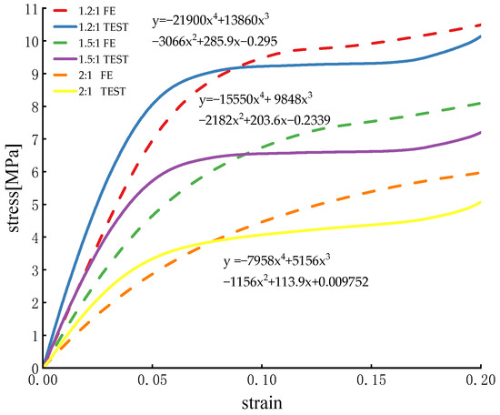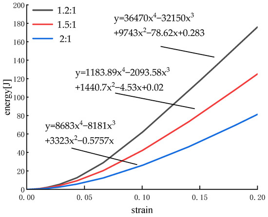 The results show that the finite element simulation of PESs with different aspect ratios has similar stress–strain variation trends as the experimental results. Because the ideal elastic–plastic model selected in the numerical simulation ignores the influence of machining accuracy and defects on mechanical properties and does not add a fracture damage coefficient, the simulation curve is higher than the actual curve, so the simulation curve is smoother (as shown in Figure 6 and Figure 7). The data analysis shows that (as shown in Table 6), the average stress of the structures with aspect ratios of 1.2:1, 1.5:1 and 2:1 was 7.89 MPa, 4.9 MPa and 3.19 MPa, and their energy consumptions were 175.96 J, 125 J and 81.24 J. With the increase in strain, the stress and energy consumption are inversely proportional to the aspect ratio. The results show that the reason for this phenomenon is that, during the compression process of the structure with nearly circular holes, the stress on the hole edge is more uniform, and the stress concentration is reduced, resulting in the strength of the whole structure being improved. Therefore, the structure with an aspect ratio of 1.2:1 shows higher compression strength than the structure with the aspect ratio of 2:1. However, in the structure with a ratio of the long axis to short axis of 2:1, due to the smaller diameter of the hole edge and the greater stress in the stress concentration area on the hole edge, the weakest part of the hole edge is more prone to bending and buckling deformation in the compression process, so it enters the yield state earlier and reduces the structure’s compression strength. Based on these characteristics, it is concluded that the PES with a ratio of length to width of 1.2 is the structure with the best stress and energy absorption properties. The curve fitting tool in MATLAB was used to basically fit the changes in force and energy, and the best prediction formula with an R2 of 0.99 was obtained. The optimal resource allocation of elliptical negative Poisson’s ratio structures in the future engineering construction field is predicted, which provides a basis for structural optimization design.