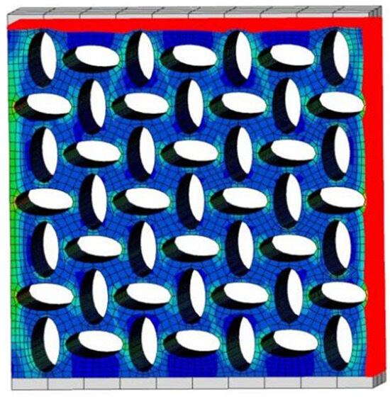In terms of material properties, Poziak et al. [28] used the finite element method to explore the geometric and material properties of composite materials with elliptical inclusions and analyzed their impact on the mechanical properties. Ellul et al. [29] found that the buckling resistance of spherical, quasi-spherical and ellipsoidal shell material structures made of isotropic expansive materials with a Poisson’s ratio less than −0.5 was significantly enhanced under internal (in the case of global and ellipsoid) or external pressure (in all cases). On this basis, Bezazi et al. [30] analyzed the cyclic compression performance of conventional, equal-density non-negative Poisson’s ratio and negative Poisson’s ratio thermoplastic polyurethane foam, and evaluated the energy consumption. Yang et al. [31] tested eight different materials and found that rubber showed the best negative Poisson’s ratio effect, while copper alloy showed the best effect among metal materials, with a Poisson’s ratio between −0.058–−0.050. In view of the research findings that different materials have significant effects on structural mechanical properties [32], buckling resistance [33] and energy consumption [34], this paper selects hyperelastic polyurethane materials as its research object [35] to further analyze the deformation characteristics of elliptical negative Poisson’s ratio structures.