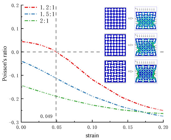 Using ABAQUS finite element simulation software, the average strain of the transverse and longitudinal plane nodes of the structure were calculated, and the overall Poisson’s ratio strain variation diagram of the structure was obtained (as shown in Figure 9). The research results show that although the bearing capacity increases with the decrease in the length–width ratio, the Poisson’s ratio gradually decreases (as shown in Figure 10), and the strain of the PES with a length width ratio of 1.2 is in the range of [0.049–0.2]; the structure shows a negative Poisson’s ratio effect. In order to better study this phenomenon, when studying the Poisson’s ratio and elastic modulus of rotating materials with a negative Poisson’s ratio, Grima et al. [48] believed that the rectangular diagonal can replace the Poisson’s ratio of materials with a positive Poisson’s ratio. The deformation characteristics of elliptical porous media during compression are similar to the behavior of rectangular negative Poisson’s ratio media. This paper further studied the relationship between the length–width ratio design parameters of a PES and its Poisson’s ratio and elastic modulus, providing a basis for the selection of structural materials and parameter design.