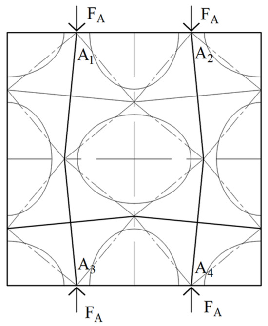 In Figure 11, it is assumed that the diagonal is a single slender rod with a side length of l; the diagonals of two squares are rigidly connected; and the diagonals of adjacent squares are hinged. When loaded on a porous medium with a negative Poisson’s ratio, it is equivalent to two forces FA of the same magnitude and direction acting on the same points A1, A2, A3 and A4, respectively. At this point, the stress states of the four diagonal slender rods are the same. It can be seen that the deformation law of these diagonal slender rods in the axial and transverse directions is also the same. Therefore, as long as the slender rods on the diagonal are analyzed for longitudinal and lateral deformation, the overall Poisson’s ratio can be calculated.