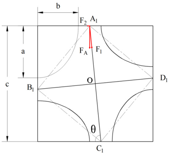 Point A1 in Figure 12 is the midpoint of the ellipse in the figure, excluding the long and wide axis parts. The ratio of the long axis to the short axis of the ellipse is R, the half-axis length b is of the short axis of the ellipse, and the edge length c is of the initial cell. Then, based on the known R and b, the half-axis length a of the long axis of the ellipse is determined. Orthogonal decomposition is performed on the axial force FA applied at point A1 in the figure along the direction of lever A1C1 and perpendicular to lever A1C1, in order to obtain the forces F1 and F2. Applying force F1 to rod A1C1, causes it to undergo compressive deformation in the direction of rod A1C1; force F2 causes a torque MO at point O, causing rods A1C1 and B1D1 to rotate around point O, resulting in the same deformation in both the axial and lateral directions. The results indicate that under axial loading, the deformation of elliptical porous materials with a negative Poisson’s ratio is divided into two parts: one part is compression deformation along the A1C1 direction; another part is the axial and lateral deformation caused by the rotation of members A1C1 and B1D1 around point O. When F1 acts alone, the material undergoes compressive deformation along the direction of rod A1C1.