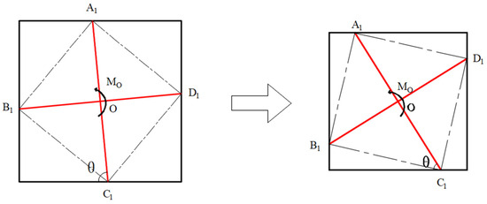 In the case of only F2, a torque MO is formed at point O, as shown in Figure 13. Apply a torque MB and a torque MC to the rods B1D1 and A1C1, respectively, which are equal to the torque MO. Due to the rotation of levers A1C1 and B1D1 around point O with torque MO, lever B1D1 rotates about the horizontal line and lever A1C1 rotates about the vertical line at the same angle Δθ, resulting in a shorter horizontal projection length of lever B1D1 and a shorter vertical projection length of lever A1C1. This causes the longitudinal and lateral deformation of the material, where Δθ is mainly related to the rotational stiffness kθ of the hinge at points B1 and B2. The expression for rotational stiffness is: