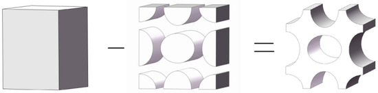 Due to the fact that the relative density of the initial cell is the same as that of the overall elliptical porous negative Poisson’s ratio material, the relative density of the material is calculated using the initial cell as an example. Figure 14 shows the formation process of the initial cell, and the volume of the cube in the figure is the apparent volume of the initial cell. However, the actual volume cannot be directly calculated and needs to be indirectly obtained by subtracting the volume Vt of the four vertical elliptical columns in the figure from the apparent volume.