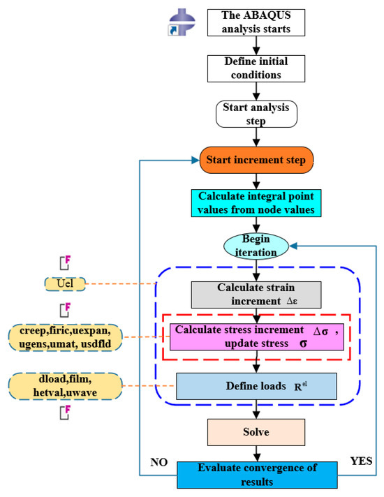 Dampers (Figure 2) were applied to the three-dimensional structure (Figure 1d) while also considering the influence of support connections on the structure. It is necessary to transform the elemental property matrix established in the local coordinate system of the element into the overall coordinate system of the system (Equation (26)). The process of ABAQUS subroutine development is shown in Figure 3. The process of program development using ABAQUS started with defining the initial conditions, followed by initiating the analysis step and the increment step. During the increment step, integral point values were calculated from node values, and the iteration began. The program calculated the strain increment and the stress increment, updated the stress, defined the loads, and solved the system. Finally, the program evaluated the convergence of results. If the evaluation indicated convergence, the process continued accordingly. The transformation matrix from the local to global coordinates is given by the following equation: