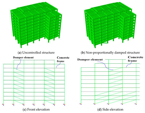 A performance-based seismic design method was employed to analyze a 10-story benchmark reinforced concrete structure (Figure 4a,b). The design reference period for the structure is set at 50 years. The seismic defense level of the structure was classified as B with a design ground motion intensity of 8 (0.20 g), and the site was categorized as Class I. The seismic design belongs to the first group, with a safety level of II and a characteristic period of 0.20 s. The damping ratio of the ordinary reinforced concrete frame structure was 0.05 [38], whereas that of the seismic-resistant structure was 0.18. The ground roughness was classified as Grade B with a basic wind pressure of 0.5 kN/m2. The structure consists of 10 stories, with a total height of 33.0 m. The dead load was 2.5 kN/m2, and the live load was 2.0 kN/m2. The dimensions of the frame beam and the secondary beam are 400 × 800 mm and 250 × 600 mm, respectively. The dimensions of the frame columns were 900 mm × 1050 mm, 850 mm × 950 mm, and 650 mm × 650 mm. The floor slab thicknesses were 100 and 120 mm. The parameters of the damping device (Figure 5) are listed in Table 1. Dampers were arranged on the first to ninth floors of spans 2 and 5 on the front and rear façades (Figure 4c) and on the first to third floors of span 2, the first to third floors of span 4, and the first to ninth floors of span 3 on the left and right façades (Figure 4d).