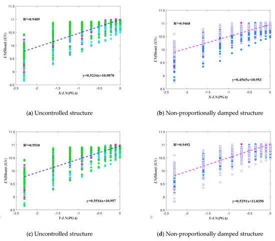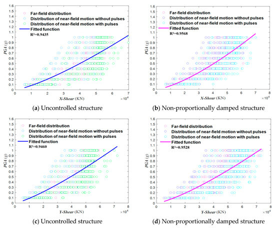 By fitting the sample data points of uncontrolled and damped structures, as shown in Figure 8, the relationships between X-direction PGA and structural shear force are, respectively, obtained as and , while the relationships between Y-direction PGA and structural shear force are obtained as and . At lower PGA levels, the PGA–shear force curves for uncontrolled structures and damped structures are relatively close. As the PGA increases, the differences between the PGA–shear force curves of the two structures become increasingly pronounced. This occurs because under small seismic actions, the effect of the base isolation devices is relatively minor, and the structural response is primarily determined by the linear stiffness characteristics of the structure itself. As the PGA increases, the non-linear characteristics of the damping devices become more significant during strong seismic actions, effectively suppressing the dynamic response of the structure and leading to a greater disparity in seismic responses between the damped structure and the uncontrolled structure. The PGA-shear force curve of the damped structure typically exhibits a smaller slope compared to that of the uncontrolled structure. This is due to the fact that the damped structure reduces the transmission of seismic forces by increasing the overall stiffness and energy dissipation of the system, thereby achieving optimal energy absorption and dissipation, which results in a relatively mild increase in bottom shear forces. At the same PGA level, the shear force of the damped structure is generally less than that of the uncontrolled structure as the damping devices effectively absorb and dissipate seismic energy, thereby reducing the seismic forces acting on the base of the structure and enhancing its seismic performance. Comparative analysis indicates that the damped structure effectively reduces bottom shear forces under equivalent seismic actions, thereby improving the overall seismic performance of the structure, primarily due to the energy dissipation and stiffness adjustment functions of the damping devices.