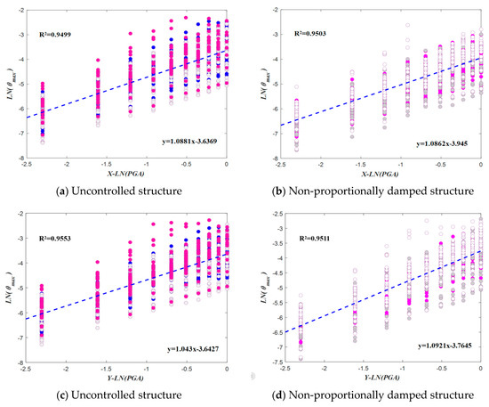 By fitting the sample data points of the uncontrolled and damped structures (Figure 10), compared to the uncontrolled structures, the slope of the fitting line for the drift seismic demand of the X-direction damped structures decreased by 0.17%, whereas the slope of the fitted line for the drift seismic demand of the Y-direction damped structures increased by 4.71%. Compared to the uncontrolled structures, the intercept of the fitting line for the drift seismic demand of the X-direction damped structures increased by 8.47%, whereas the intercept of the fitting line for the drift seismic demand of the Y-direction damped structures increased by 3.34%.