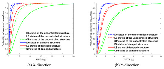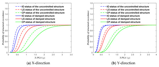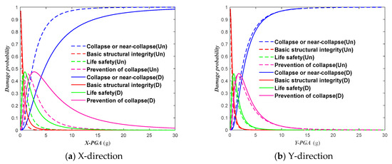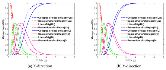 According to the ACT-63 standard [45], there is a recommendation for a collapse probability of 10% as the threshold for evaluating the structural collapse resistance. As shown in Figure 13, when PGA = 0.9 g, the probability of collapse or near-collapse in the X-direction for uncontrolled structures is 10.59%, and in the Y-direction, it is 10.97%. For the damped structures, the probabilities of collapse or near-collapse in the X- and Y-directions were 2.89% and 6.12%, respectively. Compared with uncontrolled structures, the life-safety surpass probability of damped structures was reduced by 72.71% in the X-direction and 44.21% in the Y-direction. As shown in Figure 14, when PGA = 1.0 g, the probability of collapse or near-collapse in the X-direction for uncontrolled structures is 14.80%, and in the Y-direction, it is 14.27%. For the damped structures, the probabilities of collapse or near-collapse in the X- and Y-directions were 4.28% and 7.50%, respectively. Compared with uncontrolled structures, the life-safety surpass probability of damped structures was reduced by 71.08% in the X-direction and 47.44% in the Y-direction.