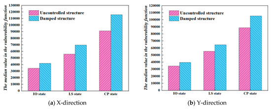 The median values of the fragility functions for the uncontrolled and damped structures in terms of immediate occupancy (IO), life safety (LS), and collapse prevention (CP) exhibited an increasing trend with higher limit states. The median shear values are consistently higher for uncontrolled structures than for damped structures. As shown in Figure 15, uncontrolled structures have lower stiffness than damped structures, resulting in larger deformations and shear responses under seismic actions. Damped structures, on the other hand, incorporate seismic devices or techniques that effectively reduce structural deformations and mitigate seismic responses, thus resulting in relatively smaller median shear values. Damped structures typically possess a better energy dissipation capacity, enabling them to absorb more energy during earthquakes and reduce shear responses. By contrast, ordinary reinforced concrete frame structures exhibit relatively weaker performances and are susceptible to direct impacts from seismic forces, leading to larger median shear values. The smaller median shear values for ordinary reinforced concrete frame structures compared with damped structures in the fragility functions may be attributed to differences in structural stiffness, energy dissipation capacity, and design concepts.