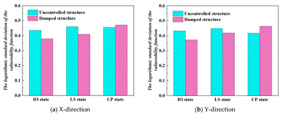 A statistical analysis was performed on the data, as shown in Figure 16. For the ordinary reinforced concrete frame structure, the logarithmic standard deviations of the seismic shear demands at the immediate occupancy (IO) and life safety (LS) performance levels were higher than those of the non-proportionally damped structure. However, at the collapse prevention (CP) performance level, the shear standard deviation of the ordinary frame was lower than that of the non-proportionally damped structure. This indicated that the non-proportional damping structure exhibited greater response variability and dispersion at the CP performance level, suggesting higher uncertainty in the structural behavior when approaching the limit state. In contrast, the ordinary frame structure showed higher dispersion at the lower damage states (IO and LS) but more reliable and stable performance at the CP limit state. Specifically, the non-proportional damping structure incorporated viscous dampers to enhance its seismic energy dissipation capacity. At the CP performance level, corresponding to structural responses near collapse, the activation of the non-linear damping mechanism in the structure under large displacements, along with the potential involvement of higher-mode effects and other non-linear deformation modes, introduced increased uncertainty in the structural response of the non-proportional damping system at the CP level. This high degree of response scatter was reflected in the significantly increased logarithmic standard deviations observed in the statistical data.