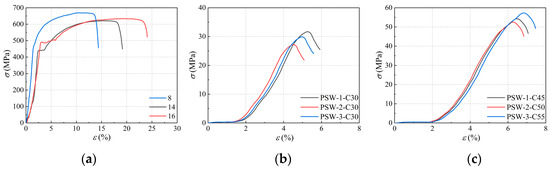 All three specimens used HRB400 grade steel bars. Unidirectional tensile tests were conducted on steel bars of different diameters according to Part 1: Method of Test at Room Temperature for Metallic Materials Tensile Test (GB/T 228.1-2021) [10]. Six specimens of each steel bar diameter were reserved for uniaxial tensile testing, and the diameter, yield strength, ultimate tensile strength, and yield strain of the steel bars are listed in Table 2. The stress–strain curves of steel bars with various diameters are shown in Figure 2a, and the stress–strain curves of the precast and CIP concrete for each specimen are shown in Figure 2b,c.
