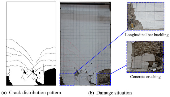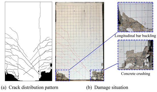In the failure stage, as the horizontal load continued to increase, the horizontal cracks in PSW-1 extended to the top of the wall height, with a maximum width of 2.7 mm. In PSW-2, the cracks also extended to the top of the wall height, with a maximum width of 2.0 mm. For PSW-3, the cracks extended to half of the wall height, with a maximum width of 2.0 mm, and the distribution of cracks was sparser compared to PSW-1 and PSW-2. Finally, at top displacements of −37.0 mm for PSW-1, 40.7 mm for PSW-2, and 34.0 mm for PSW-3, the outermost longitudinal bars were exposed and buckled under compression, while the concrete at the base of the wall was crushed and spalled. The failure modes and crack distributions are shown in Figure 7, Figure 8 and Figure 9.