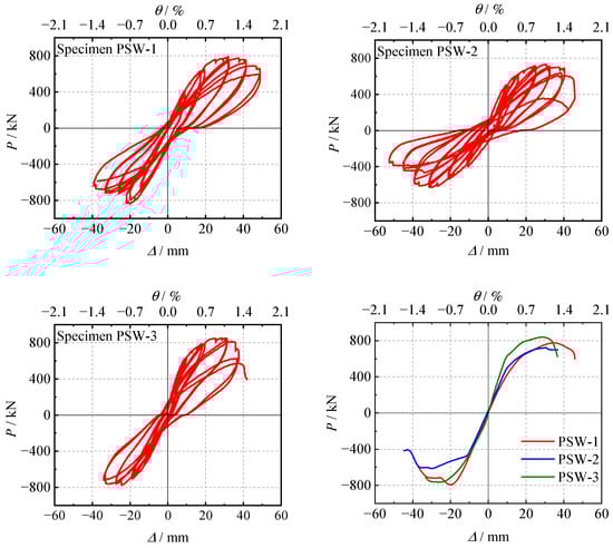 The axial load ratio of specimens PSW-1, PSW-2, and PSW-3 is 0.2, corresponding to axial loads of 944 kN, 997 kN, and 1056 kN, respectively. According to the Specification for Seismic Test of Buildings (JGJ/T 101-2015) [11], the horizontal load is applied using a displacement-controlled loading method. The loading is applied sequentially at displacement angles of 0.1%, 0.2%, 0.4%, 0.6%, 0.8%, 1.0%, and higher, with two cycles at each level. The test is terminated when the specimen fails completely or when the axial-bearing capacity drops to 85% of the peak load. Figure 4 shows the schematic diagram of the loading process.