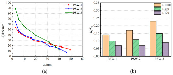 To evaluate the stiffness and stiffness degradation behavior of prefabricated shear walls with strength differences under low-cycle horizontal cyclic loading, the secant stiffness at the maximum displacement of each loading cycle is defined as the equivalent stiffness K. Figure 12a shows a comparison of the stiffness degradation curves, while Figure 12b presents the relationship between stiffness degradation and typical interstory drift angles. Three typical states were selected as follows: interstory drift angles of 1/1000 (the limit for interstory drift angle), 1/300 (minor damage [10]), and 1/120 (elastic–plastic interstory drift angle limit).
