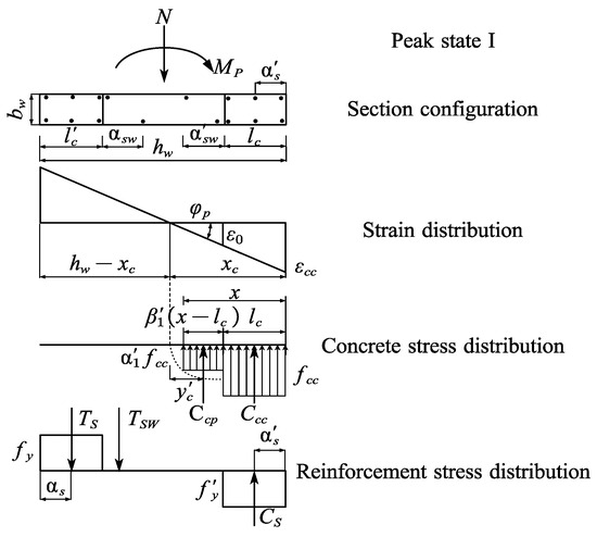 According to Equation (17), the height of the compression zone under the peak state of the wall can be determined. Taking the moment about the centroid of the wall section, the peak bending moment Mp of the section can be obtained.