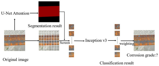 First, a sliding window sampling method is employed to divide the original image into multiple fixed-size rectangular windows. This process not only helps reduce the complexity of image processing but also preserves local corrosion information. The size of the sliding window is determined based on the component dimensions, image resolution, and actual detection requirements, ensuring that the corrosion areas are included within the windows. Next, each window is processed using the pre-trained U-Net Attention semantic segmentation model. The model classifies each pixel in the image, accurately identifying the component region and the background. After segmentation, windows containing component pixels are retained while irrelevant background windows are discarded, thus enhancing the efficiency of subsequent processing. The filtered component windows are then input into the pre-trained corrosion grade classification model based on the Inception v3 convolutional neural network for transfer learning. Finally, the corrosion grades of all windows containing components are averaged with weights assigned according to the window area or the relative importance of the corrosion area, resulting in the calculation of the overall corrosion grade for the target component.