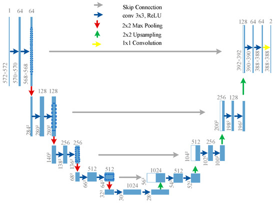 The U-Net network is characterized by its simple architecture, fewer parameters, and strong versatility. Its U-shaped structure consists of three main components: the encoder, the decoder, and the skip connections [23,24,25]. As shown in Figure 2. The encoder performs downsampling using 3 × 3 convolutions and 2 × 2 max pooling, which compresses the image size and increases the number of channels to extract shallow features [26,27,28,29]. The encoder can also be replaced with other convolutional models. The decoder, on the other hand, employs 3 × 3 convolutions and 2 × 2 transposed convolutions for upsampling, restoring the image size and the number of channels. Skip connections are used to merge the feature maps from the encoder and decoder, allowing for the combination of shallow and deep features, which enhances the segmentation performance of the model [30,31,32].