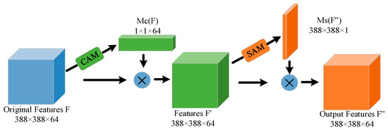 In binary classification datasets, feature maps often contain excessive features and irrelevant information after multiple convolutions and upsampling, which can reduce the model’s segmentation accuracy. To enhance segmentation precision, this study introduces a Convolutional Block Attention Module (CBAM) before the output layer of the U-Net network [33,34,35]. This module redistributes features, increasing the contribution of relevant features while diminishing the impact of irrelevant ones, thereby achieving automatic optimization of feature weights. The CBAM module consists of two components: the Channel Attention Module (CAM) and the Spatial Attention Module (SAM). First, the input feature F passes through the Channel Attention Module to generate a 1 × 1 channel weight Mc(F), which is then multiplied with the original feature to produce F′. Next, F′ is processed by the Spatial Attention Module to generate a spatial weight Ms(F′) with a single channel, which is multiplied with F′ to yield the final feature F′′. The dimensions of F′′ are the same as those of the original feature F, allowing the CBAM module to be directly integrated into the network without modifying its structure [36,37,38]. The specific structure is illustrated in Figure 3.