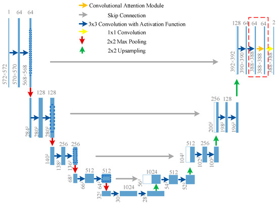 The structure of the improved U-Net Attention model is illustrated in Figure 4. The input sample images are processed through the U-Net network, which performs encoding and decoding to produce a set of feature maps with dimensions of 388 × 388 × 64 [39,40]. After passing through the CBAM module, the channel, and spatial features undergo weight updates, resulting in output feature maps of the same dimensions. Finally, a 1 × 1 convolution layer is applied to generate two feature maps, each measuring 388 × 388.