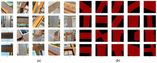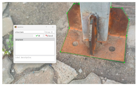 The semantic segmentation dataset requires the classification of pixels in different regions of the images. For steel structure images, it is essential to label each pixel to ensure that the model can accurately differentiate between structural components and the background. In this study, the images obtained were manually annotated using Labelme, distinguishing between the steel structure components (labeled as “structure”) and the rest is the background. As shown in Figure 6.