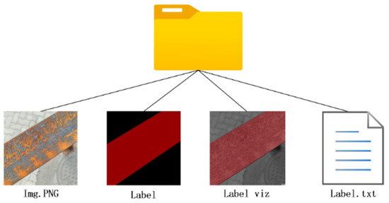 The semantic segmentation dataset consists of the original PNG images used for identification, along with the processed Labelme annotated images. This information is stored through the coordinates of the labels. Figure 7 provides an example of the semantic segmentation dataset, where the label represents the semantic labels, label viz refers to the images with legends, and the txt file is used to store the label names along with their corresponding boundary point coordinates.