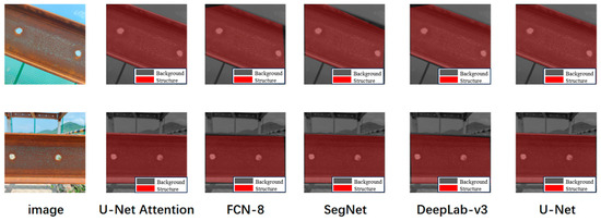 To validate the segmentation performance of the proposed U-Net Attention model for distinguishing between components and background, four commonly used semantic segmentation models, U-Net, SegNet, FCN-8, and DeepLab-v3, were also trained as a comparison. To ensure a fair and accurate comparison, the hyperparameters for all models were selected to be identical. Two samples from the test set were chosen, and the segmentation results of all five models are displayed in Figure 9.