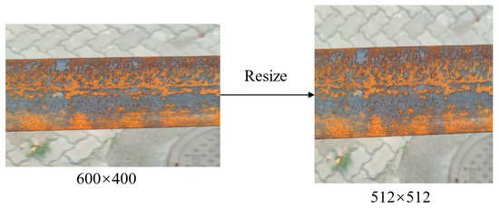 To enable the U-Net Attention network to segment steel structure images with complex backgrounds captured on-site, it is necessary for the images to conform to the input dimensions required by the network. Therefore, prior to inputting the images, preprocessing is conducted to resize them from their original dimensions to 512 × 512 pixels, as shown in Figure 10. In the field of machine vision, image size conversion is typically achieved by altering the dimensions of the image matrix and its pixel content. In this study, the resize function from OpenCV is utilized for image scaling, where the specified pixel dimensions are set to 512 × 512 pixels. To avoid the occurrence of aliasing artifacts during the resizing process, bilinear interpolation which is the default interpolation method is employed.