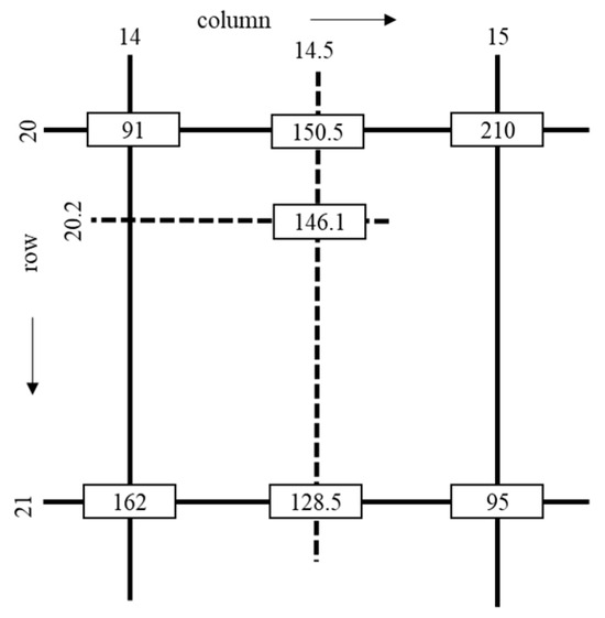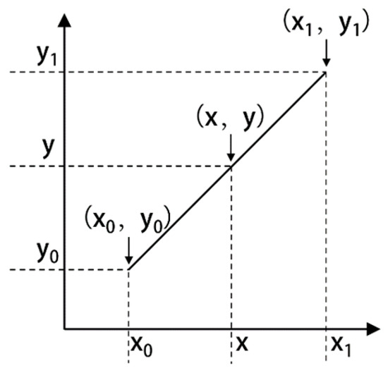 Linear interpolation refers to an interpolation method where the interpolation function is a first-degree polynomial, resulting in zero interpolation error at the interpolation nodes. This method connects two known values with a straight line to determine the value of an unknown quantity between them. As illustrated in Figure 11, the distances x and x0, x1 are used as weights for the weighted averages of y0 and y1, as shown in Equations (5) and (6).